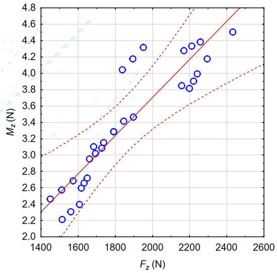Moreover, during the process of drilling holes in superalloy Inconel 718 material, correlations were observed between the recorded values of axial force and torque. The relationship between Fz and Mz together with the confidence interval for α = 0.05 is shown in Figure 21 (R = 0.91).