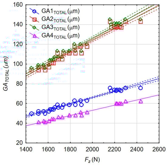 Due to the correlated values of vc, f, Fz, and Mz, there was also a correlation between these values and the engine body deflection. A graph showing the relationships between the recorded values of the Fz force and the body deflections GA1TOTAL, GA2TOTAL, GA3TOTAL, and GA4TOTAL together with the confidence intervals for α = 0.05 is shown in Figure 22. For all these cases, the Pearson correlation coefficients were R = 0.98. In the case of the analysis of the influence of the Fz force on the deflection values HA1RADIAL, HA2RADIAL, HA3RADIAL, and HA4RADIAL, the Pearson correlation coefficients were in the range R = 0.97–0.98. Such values of this coefficient indicate a strong relationship between the analyzed factors. Also, the analysis between the values of the moment Mz and the global deflection GATOTAL and the radial displacement of the drilled hole axis HARADIAL provides the ability to obtain values of the R coefficients in the ranges of 0.89–0.90 and 0.88–0.90, respectively.