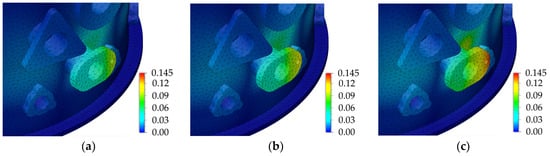 Taking into account the above correlations, for the designed engine case body, there is a relationship between the values of the applied cutting parameters, the deflection of the engine case body, and the radial displacement of the drilled hole axis. This is a consequence of the influence of the used cutting parameters on the values of axial force and torque, which affects the deformation of the engine body. The effects of increasing the feed per revolution f at a constant cutting speed of vc = 25 m/min on the body deformations occurring during the drilling of adapter No. 3 holes are shown in Figure 23a–c. In order to better illustrate the analyzed impact, only parts of the geometry are presented.
