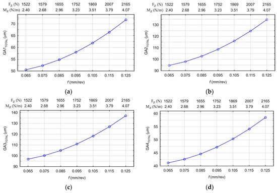 The influences of the feed per revolution f (at the constant vc = 25 m/min), axial force Fz, and the torque Mz values on the GATOTAL body deflection occurring during the drilling of individual holes: (a) GA1TOTAL, (b) GA2TOTAL, (c) GA3TOTAL, and (d) GA4TOTAL.