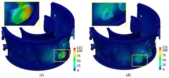 On the other hand, a smaller effect of hole machining on the body deflection was observed for the tooling adapters located in the upper and lower areas of the engine case body. In these places, the stiffness of the designed body was the highest because it is located near the flanges on which the body is fixed during drilling. Figure 26a–d show the calculated body deflections for the machining of individual tooling adapters together with the middle values adopted for cutting parameters (vc = 25 m/min, f = 0.1 mm/rev).