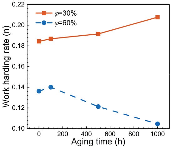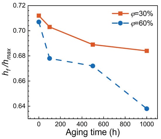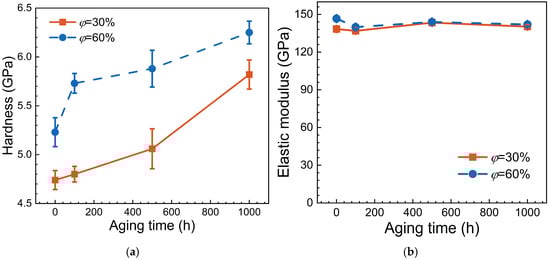 - The nano-indentation behavior is closely related to the microstructure of materials, especially to the size and density of precipitation particles. The microstructural evolution significantly influences the nucleation and movement of dislocations, thereby affecting the macro-mechanical properties of materials. It is worth noting that the particle sizes of the studied materials are smaller, i.e., the dislocation cutting mechanism still plays a key role. For low volume fractions ( = 30%), wider dislocation channels reduce the hindrance of dislocation movement, leading to relatively low nano-hardness. Conversely, for the alloys with = 60%, the harmful TCP phases precipitate substantially within the matrix with increasing aging time, further enhancing the alloys’ nano-hardness.