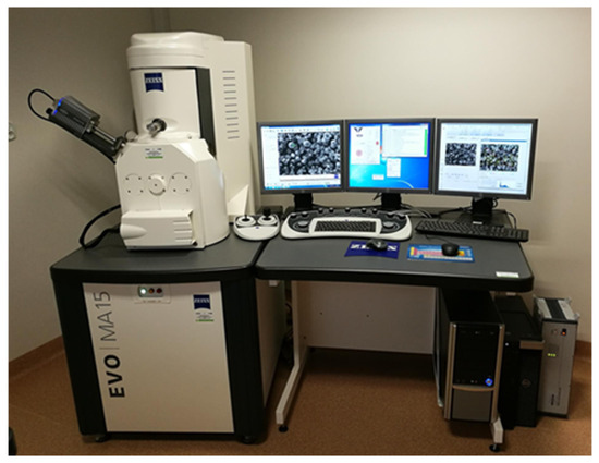 To better understand the effect of the carbonisate particles on the properties of the composite, a Zeiss EVO MA 15 Figure 2 scanning electron microscope was used to study the microstructure of the carbonised and the composites made. The instrument allows electron images of samples to be obtained with a resolution of 3 nm at 30 kV. The range of possible magnifications is from 5 to 1,000,000 times. The microscope allows observation of samples weighing up to 500 g (with full mobility of the microscope table in XYZ directions) or up to 5 kg (then the movement of the table is limited to directions along the XY axis).
