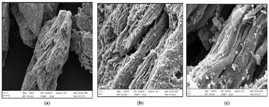 Structure of carbonisate with 0.5 mm fraction (a) magnification 200×; (b) magnification 1000×; (c) magnification 5000×.