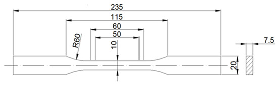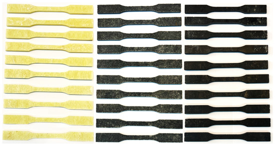 To determine the effect of the content of carbonisate on the properties of the produced composite materials, samples were prepared for static tensile testing by the requirements of the current standard [22], as shown in Figure 5. The composite material specimens were made by the water jet cutting method. This method ensured very accurate preservation of the made specimens, as well as avoiding the influence of temperature on changes in the structure of the material (in the case of mechanical processing). The prepared specimens for static tensile testing are shown in Figure 6.