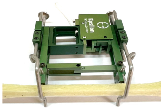 Static tensile testing of the tested composites was carried out on a hydraulic-powered universal testing machine type MPMD P10B with TestXpert II software version 3.61. from Zwick and Roell. A strain gauge from Epsilon, type 3542, with an initial measurement length L0 of 50 mm, shown in Figure 7, was used to measure elongation during the test. 10 measurement tests were performed for each combination of specimens. The tensile speed during the static tensile test of all specimens was 1 mm/min. The average values of the static tensile test and strain of the tested composite materials are summarised in Table 3.
