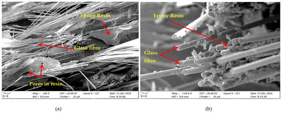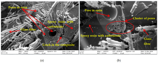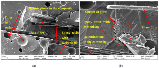 For the variant I sample without carbonisate addition, the tensile strength was obtained at the level of σ = 94.62 MPa and elongation ԑ = 1.017%. The addition of 7.5% of carbonisate (variant II samples) with a fraction of 0.5 mm resulted in a reduction of the tensile strength to σ = 86.07 MPa, with almost unchanged elongation ԑ = 1.016%. A similar trend was observed in sample III, where the strength dropped from σ = 96.48 MPa to σ = 83.66 MPa (variant IV samples) after the addition of 5% of carbonisate, with a simultaneous reduction of elongation from ԑ = 0.985% to ԑ = 0.880%. These results suggest that the addition of carbonisate weakens the bond between reinforcement fibres and resin. The results of the calculations of the entropy metric also showed a decrease for the samples with carbonisate. For the composites of variant I without the addition of carbonisate, the entropy value was = 48 MPa and elongation = 0.39%, while for the sample with carbonisate, variant II, these values decreased to = 27 MPa and = 0.22%. Similarly, in the case of composites of variant III, the entropy decreased from = 64 MPa (elongation = 0.56%) to = 58 MPa for sample IV (elongation = 0.50%). The decrease in these parameters indicates a more ordered but less flexible structure, which may be a consequence of introducing a filler with relatively large particles (0.5 mm). The decrease in the tensile strength and plasticity of the material may result from the decreased adhesion between the reinforcement and the composite matrix caused by the presence of the additive. This is confirmed by the results of SEM structure analysis carried out for variants II and IV containing carbonisate, showing the presence of cracks, delaminations and numerous pores.