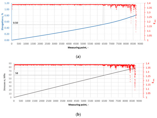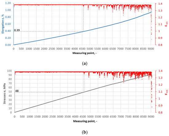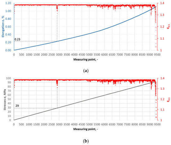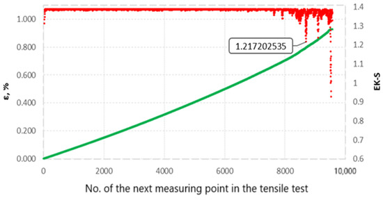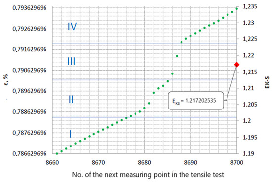 The “Entropy K–S” software version 1.20 (Authors: Łukasz Mrugała—programmer, code author; Grzegorz Hajdukiewicz—functionality concept; Gdańsk, Poland 2021) was used for the calculations, which enabled calculation of metric entropy for each interval and obtaining a set of metric entropy values. The metric entropy values are presented graphically and compared with the elongation plot ε = f(t) in Figure 14.