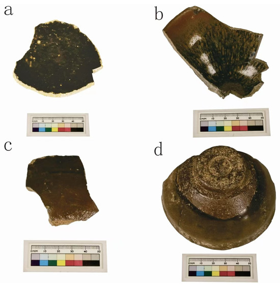 Photographs of selected Guangyuan kiln samples. (a). Pure black glazed ware GY-7; (b). Hare’s fur glazed ware GY-10; (c). Glossy brown glazed ware GY-14; (d). Matte brown glazed ware GY-22.