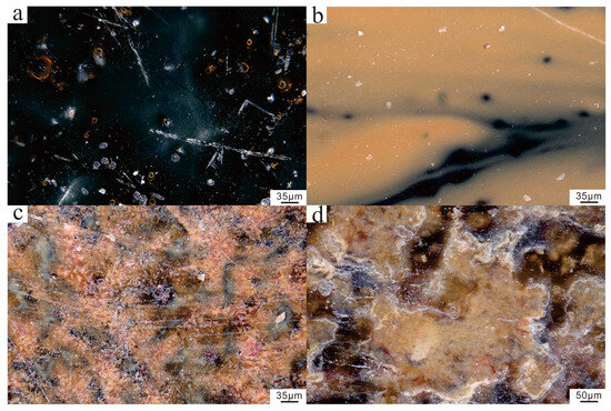 Optical microscope images. (a) Black glazed ware, (b) Hare’s fur glazed ware, (c) Glossy brown glazed ware, (d) Matte brown glazed ware.