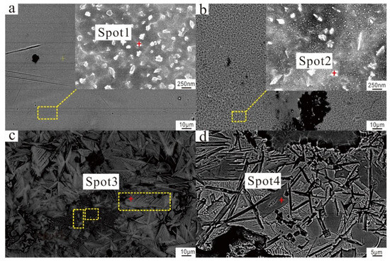 SEM images of crystal morphology on the surface of various high-temperature iron-series glazed wares (a) Pure black glazed ware, the image in the top right corner is the enlarged area of the yellow box, and the red dot indicates the test location for Spot 1 in Table 4. (b) Hare’s fur glazed ware, the image in the top right corner is the enlarged area of the yellow box, and the red dot indicates the test location for Spot 2 in Table 4. (c) Glossy brown glazed ware, there are three different types of crystals within the yellow frame, and the red dot indicates the test location for Spot 3 in Table 4. (d) Matte brown glazed ware, the red dot indicates the test location for Spot 4 in Table 4.