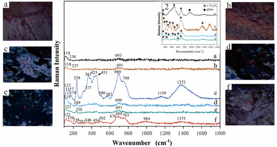 Raman spectra of dendritic crystals on the surface of black glaze and paste glaze samples from the Guangyuan kiln measured at low power. 2: Raman spectra of crystals tested at high power. (a) Granular crystals in pure black glaze; (b) Dendritic crystals in hare’s fur glaze; (c) Large dendritic crystals in glossy brown glaze; (d) Leaf−like crystals in glossy brown glaze; (e) Fine dendritic crystals in glossy brown glaze; (f) Crystals in matte brown glaze.