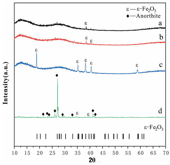 To further identify the crystalline phases present on the glaze surface of black-glazed and brown-glazed wares, XRD analysis was performed on the crystals, as illustrated in Figure 6. The diffractograms reveal that both the crystals of the pure black and the hare’s fur glazed ware are primarily composed of an amorphous glassy phase, exhibiting indistinct diffraction peaks. Notably, the crystals of the pure black glazed ware display only a weak diffraction peak corresponding to ε-Fe2O3 at 38.5°. Those of the hare’s fur glaze and brown glazed wares exhibit weak ε-Fe2O3 diffraction peaks at 38.5°and 40.4° [34], suggesting a limited presence of crystalline phases with underdeveloped crystal structures in both glazes. The crystals of the brown glazed ware exhibit pronounced diffraction peaks, indicative of a higher degree of crystallinity. The XRD pattern of the glaze surface of glossy brown glazed wares reveals diffraction peaks at 18.9°, 35.3°, 38.3°, 40.5°, and 59°, all corresponding to the ε-Fe2O3 phase [33,34]. These peaks are sharp and intense, further confirming the high crystallinity of ε-Fe2O3 on the glaze surface of the glossy brown glazed ware, which aligns with the observation of abundant large-sized dendritic crystals through SEM observation. Furthermore, the glaze surface of matte brown glazed wares exhibits the presence of two distinct crystalline phases. In addition to the characteristic peaks corresponding to anorthite [29], two faint diffraction peaks indicative of ε-Fe2O3 are also observed. This confirms that the crystalline phase in the matte brown glaze is predominantly anorthite, with a minor presence of ε-Fe2O3 crystals.