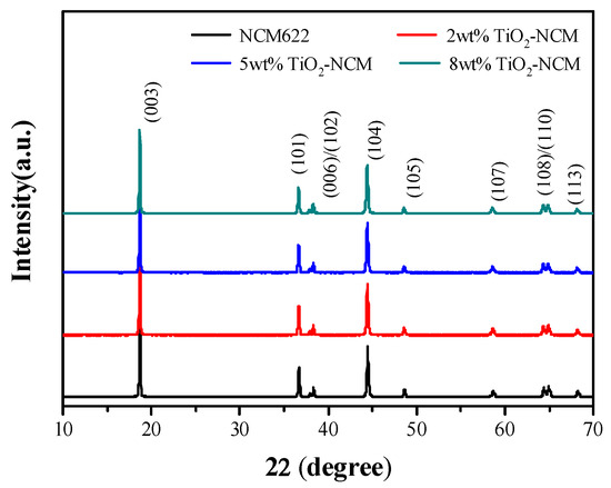 Figure 2 shows the X-ray diffraction (XRD) patterns of NCM622 and three modified samples with different amounts of TiO2 coating. As shown in Figure 2, the diffraction peaks of all samples match well with the standard PDF card (JCPDS, No. 87-1560), which corresponds to the R3m space group of the hexagonal α-NaFeO2 structure [32]. The more obvious splitting of the (006)/(012) and (018)/(110) peaks observed at 38° and 65°, respectively, suggested that the material has a good lamellar structure and also implies that the original structure of the material is well preserved by the capping method used [19]. In addition, no diffraction peaks of TiO2 were observed in the XRD spectra of the modified samples, which may be due to the small amount of cladding used [20]. It is also observed that compared with the NCM622 bulk sample, the (003) peak and the (104) peak of the modified sample have a leftward shift, and there is no obvious change in the peak intensity of the diffraction peaks, which suggests that for the TiO2-coated sample, a small amount of Ti4+ may have diffused into the structure of the NCM622 bulk phase, broadening the (003) crystal plane spacing [Figure S1a,b] [33].