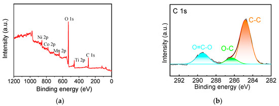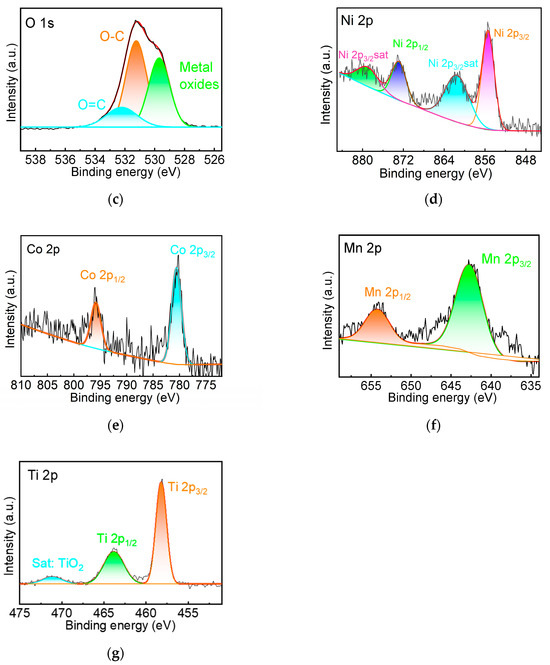 Figure 3 shows the XPS full spectrum of the 5 wt% TiO2-coated NCM sample, from which it can be observed that there are characteristic peaks of Ni, Co, Mn, C, and O elements on the surface of the material, and there are also characteristic peaks of Ti element on the surface of the 5 wt% TiO2-coated NCM sample. Figure 3c shows the C 1s spectra, from which it can be seen that three peaks located at binding energies of 284.8, 286.4, and 289.3 eV were fitted to three peaks, which are attributed to sp2 bonded C-C, C-O, and C=O, respectively. The Ni 2p1/2 and Ni 2p3/2 peaks in the 5 wt% TiO2-coated NCM are located at 872.68 eV and 855.08 eV, respectively; the Mn 2p3/2 and Mn 2p1/2 peaks are located at 642.58 eV and 653.98 eV, respectively; and the characteristic peaks at the positions of 780.28 and 795.18 eV correspond to Co 2p3/2 and Co 2p1/2, respectively [30]. It can be seen that the TiO2-coated NCM622 modified material did not change the valence states of Ni, Mn, and Co elements. The characteristic peaks at positions 529.3 eV, 531.6 eV, and 532.5 eV corresponded to O1s. The characteristic peaks of Ti 2p3/2, Ti 2p1/2, and TiO2 appeared in the 5 wt% TiO2-coated NCM sample at positions located at 458.2 eV, 463.9 eV, and 472 eV (Figure 3g), which indicated the presence of Ti4+ on the surface of the 5 wt% TiO2, which was in agreement with the previous study [31]. Figure S2 is the XPS spectra of bare NCM622. Figure S2a is the survey spectrum of bare NCM622;there are characteristic peaks of Ni, Co, Mn, C, and O elements on the surface of the material. Figure S2b–d are characteristic peaks of Ni 2p, Co 2p, and Mn 2p, respectively, showing similar binding energies with the 5 wt% TiO2-coated NCM, except without the Ti element.