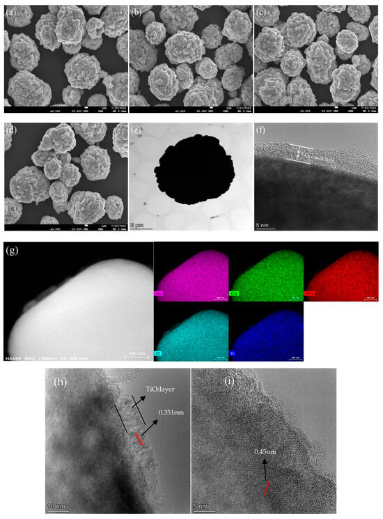 The SEM images of (a) NCM622, (b) 2 wt% TiO2-NCM, (c) 5 wt% TiO2-NCM, and (d) 8 wt% TiO2-NCM. (e) TEM image of 5 wt% TiO2-NCM; (f) HRTEM image; (g) FE-SEM elemental mapping of 5 wt% TiO2-NCM microspheres. (h,i) HRTEM images of 5 wt% TiO2-NCM.
