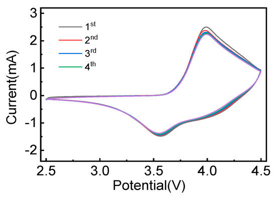 Figure S3 and Figure 5 show the cyclic voltammetry (CV) curves of the NCM622 and 5 wt% TiO2-NCM samples. In the first cyclic voltammetry curve of the NCM622 and 5 wt% TiO2-NCM, the oxidation process of Ni2+/Ni4+ and the anodic delithiation reaction occurred at the oxidation peak position of 3.9~4.1 V, while the reduction process of Ni2+/Ni4+ and the anodic lithium embedding reaction occurred at the reduction peak position of 3.55~3.7 V. Compared with the NCM622 sample, the reproducibility of the CV curves of the 5 wt% TiO2-NCM material is better as the number of scanning turns increases, indicating that the 5 wt% TiO2-NCM material has excellent cycling stability. In addition, the oxidation peak moves from the high-voltage position in the first turn to the low-voltage direction in the second and third turns, indicating that the first charging and discharging process is an electrochemical activation process for the material to carry out in order to make the cation arrangement more orderly. This is advantageous for the detachment and embedding of Li ions in the subsequent electrochemical reaction process, which is manifested by the subsequent decrease in the oxidation peak voltage in the second and third turns [30,31,32].