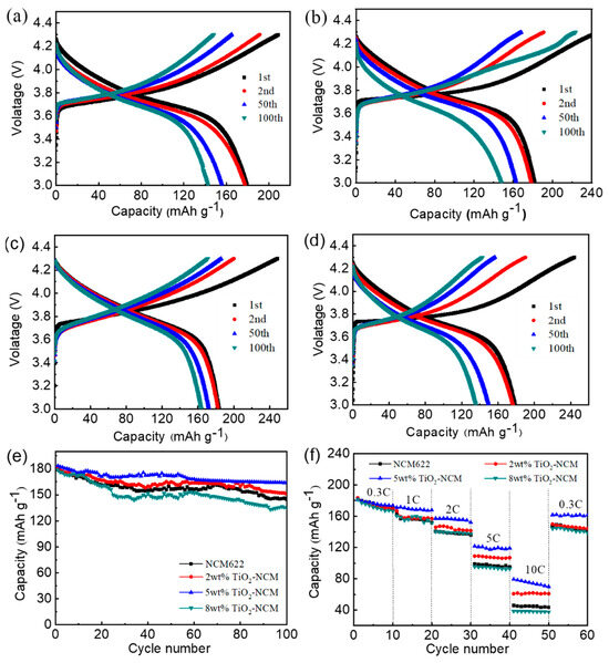 The constant current charge–discharge curves, cyclic stability, and rate performance of pristine NCM622, 2 wt%, 5 wt%, and 8 wt% TiO2-NCM samples are shown in Figure 6a–d. In Figure 6a–d, all samples exhibit a plateau region in the first discharge curve, related to the redox reaction between Ni2+/Ni4+ and Co3+/Co4+ brought about by deintercalation and intercalation of Li+ ions in the crystal lattice. The first cyclic discharge capacity of the 5 wt% TiO2-NCM at 0.3 C is 183.5 mAh g−1, which is higher than that of the pristine NCM622 of 179.2 mAh g−1, and the average Coulombic efficiency (CE) of 5 wt% TiO2-NCM can reach 100%. After 100 cycles, the pristine NCM622 shows a discharge capacity of 145 mAh g−1, whereas 5 wt% TiO2-NCM can maintain a discharge capacity of 163.9 mAh g−1. The above results indicate that the 5 wt% TiO2-NCM has an excellent reversible specific capacity compared to the pristine NCM622. Furthermore, in Figure 6a–d, the voltage plateau of NCM811 also has a more substantial decline with the increase in the number of cycle turns. The charge–discharge curves of 2 wt% and 5 wt% TiO2-NCM electrode materials are more compact, and the voltage and specific capacity decay more slowly. However, the voltage plateau of the 8 wt% TiO2-NCM electrode material also has a large decline with the increase in the coating amount, which may be due to the drastic side reactions in the material with the increase in the TiO2 coating amount [31]. This proves that the moderate amount of TiO2 coating has a better protective effect on the material, isolating the direct contact between the active substance and the electrolyte, reducing the occurrence of side reactions, lowering the interfacial impedance, and reducing the polarisation of TiO2-NCM electrode material [28].