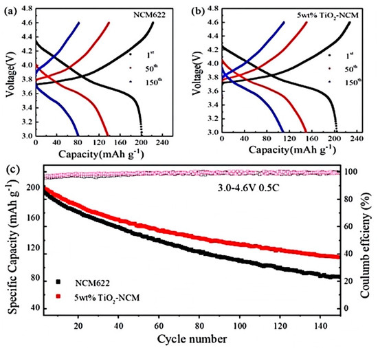 Figure 7 shows the cycling performance of NCM622 and 5 wt% TiO2-NCM622 materials (at 3.0–4.6 V, 0.5 C). As can be seen from the figure, after 150 cycles, the 5 wt% TiO2-NCM622 cathode material still releases a discharge-specific capacity of 107.3 mAh g−1, which is higher than the unmodified NCM622 material (80.8 mAh g−1). At the beginning of the cycle, the two materials have similar cycle tendencies. As the number of cycles is increased, the capacity of unmodified NCM622 decays more seriously, and the voltage plateau gradually disappears during the cycling process, resulting in a more serious polarisation phenomenon. In contrast, 5 wt% TiO2-NCM622 electrode material shows a smaller degree of electrochemical performance degradation. This is mainly attributed to the fact that the appropriate amount of TiO2 coating layer avoids the contact between the active material and the electrolyte, inhibits the dissolution of transition metals and the side reaction with the electrolyte, stabilizes the material structure, reduces the dynamic mixing of cations, and improves the cycling and multiplicity performance of the material [34].
