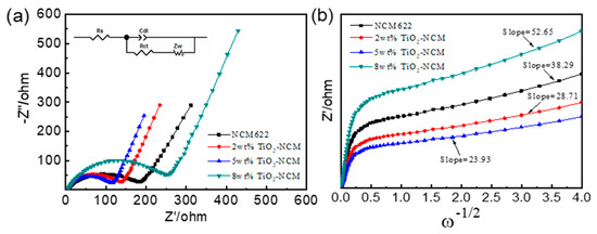 (a) Nyquist plots of NCM, 2 wt% TiO2-NCM, 5 wt% TiO2-NCM, and 8 wt% TiO2-NCM electrodes (the inset is an equivalent circuit.); (b) the linear fitting diagram of the Warburg impedance.