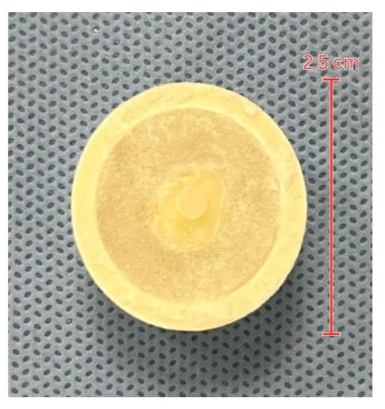 One hundred and twenty human non-carious primary molars were collected from multiple dental clinics located in Riyadh, Saudi Arabia. The teeth were sterilized and stored in distilled water at room temperature until the time of the experiment. The radicular area of each primary molar was trimmed and embedded in plasticized polyvinyl chloride (PVC) of 2 cm length. The teeth were randomly divided into three groups, namely group 1: RMGIC; group 2: Alkasite; and group 3: GIC. Occlusal surfaces were trimmed to expose a flat occlusal surface of mid-coronal dentine. All specimens were stored in an incubator (Memmert Universal Oven, Germany) at 37.5 °C and 100% humidity until the day of the experiment. All specimens were rinsed and dried directly before the test material was applied. An impression was made on a columnar metal blank of 3 mm diameter and 2 mm height that was created using putty impression material to standardize the diameter of all testing materials in all samples. The putty rubber mold was carefully filled with test materials to prevent any air bubbles and voids. Then, the materials were placed on the flat dentin surface of specimens for all groups. The surface of the test material made complete contact with the flat dentin surface and avoided contact with the enamel surface (Figure 1). SDI Riva self-cure, SDI Riva light cure, and Alkasite were handled according to the manufacturer’s instructions (Table 1). Each group was then divided into immediate and delayed subgroups. The immediate subgroups were tested after 24 h of material application, whereas the delayed subgroups underwent artificial aging using a thermocycling machine (Huber, SD-Mechatronik-Thermocycler, Berching, Germany). The thermocycling process involved subjecting the samples to 5000 cycles at temperatures between 5 °C and 55 °C to simulate 6 months of physiological use.