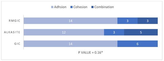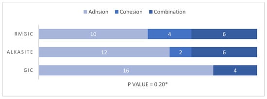 The immediate and delayed modes of failure of the study materials are presented in Figure 3 and Figure 4, respectively. Adhesion failure was observed to be the major mode of failure in all immediate tested groups, namely 70% in the RMGIC and GIC groups and 60% in the Alkasite group. The cohesion modes of failure were observed to be 15% in the RMGIC and Alkasite groups and 30% in the GIC group. Lastly, the combination type in immediate SBS was observed to be 15% in the RMGIC group, 25% in the Alkasite group, and 0% in the GIC group. However, no statistically significant difference was observed in the mode of failure between the study materials (p = 0.16). Similarly, in the delayed tested groups, the adhesion mode of failure was found to be the predominant type, with 50% in the RMGIC group, 60% in the Alkasite group, and 80% in the GIC group, followed by the combination type, with 30% in the RMGIC group, 30% in the Alkasite group, and 20% in the GIC group. Cohesion failure was observed the least, with 20% in the RMGIC group, 10% in the Alkasite group, and 0% in the GIC group. However, no statistically significant difference was found in the mode of failure between the delayed groups (p = 0.20). Photographs of the different types of failure under a microscope are shown in Figure 5. A clear dentin surface is shown in Figure 5a, which represents adhesion failure, where complete separation between the tooth structure and the material happened. A separation between materials molecules as result of cohesion failure is shown in Figure 5b, where residuals of the material can be noticed on dentin surface. Finally, shown Figure 5c shows a combination between adhesion and cohesion failure, where part of the dentin surface is cleared and some of the material is still adhered to the other part.