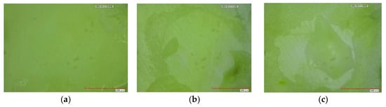 Photographs obtained using a digital microscope (50×) showing the (a) adhesion, (b) cohesion, and (c) combination modes of failure.