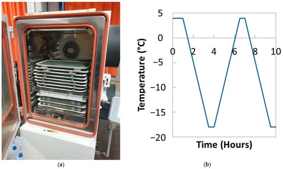 (a) Experimental setup and (b) freeze–thaw cycles [].