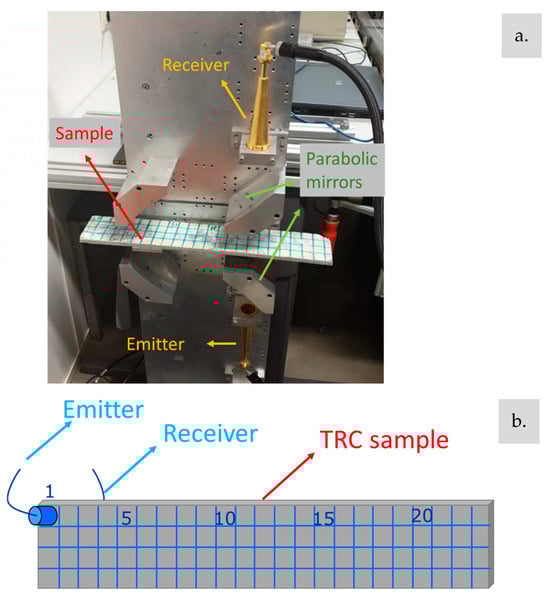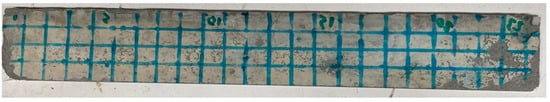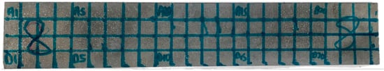 To assess the distribution of UPV through the thickness of the TRC specimens, a grid of 92 points—arranged in 4 rows and 23 columns—was marked on each specimen, as shown in Figure 2. The experimental setup included two resonant piezoelectric sensors at 150 kHz (emitter–receiver configuration). The emitter was connected to an Agilent 20 MHz waveform function generator, set to emit a single 150 kHz sinusoidal pulse with an amplitude of 10 V. No coupling agent was used in this case, as it would be absorbed in the external pores of the cementitious matrix, obstructing the water entry, and thus interfering with the freeze–thaw deterioration, in addition to impacting the MMW measurements.