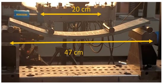 Every 50 freeze–thaw cycles, the mass of each TRC specimen was recorded, followed by monitoring using MMW spectrometry and UPV. After these measurements, three specimens were removed from the climate chamber and subjected to four-point bending tests. This procedure was repeated for up to 150 cycles. The TRC specimens were tested under displacement-controlled quasi-static four-point bending at a rate of 2 mm/min (see Figure 4) using an INSTRON 5885H machine (From Instron, Ile-de France, France). In total, 12 specimens were tested in bending.