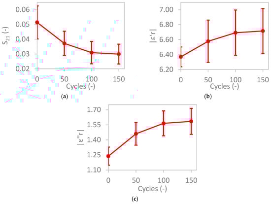 Average (a) S21, (b) real (ε′r), and (c) imaginary components of relative permittivity (ε″r) for TRC specimens subjected to freeze–thaw cycles.