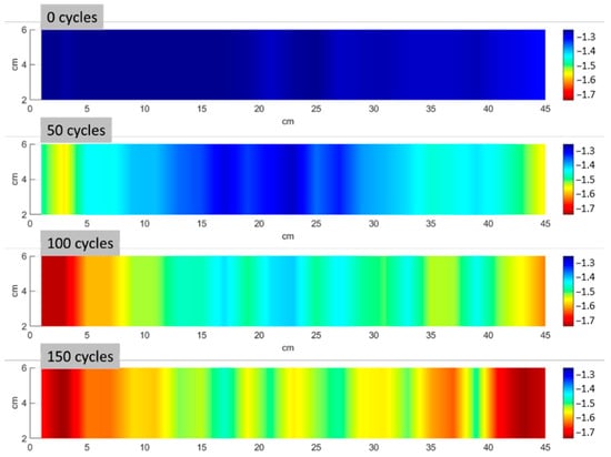 Figure 10 and Figure 11 show the distribution of ε′r and ε″r components of permittivity across 23 measuring points for a representative sample at intervals of 50 freeze-thaw cycles. Areas marked in red indicate a high ε′r and ε″r, corresponding to zones with a greater degree of damage, as confirmed by visual inspection and lower UPV values. The MMW mapping reveals that areas with elevated permittivity are concentrated along the specimen edges, highlighting the directional nature of the damage. This observation aligns with the damage patterns revealed by both UPV mapping (Figure 8) and visual inspection (Figure 9). Furthermore, as the number of freeze–thaw cycles increases, the areas with a high real and imaginary permittivity expand. The agreement between the MMW results and UPV demonstrates the potential of the MMW technique for the contactless detection of freeze–thawing effects. The most pronounced results obtained in the change in the imaginary part of the permittivity.