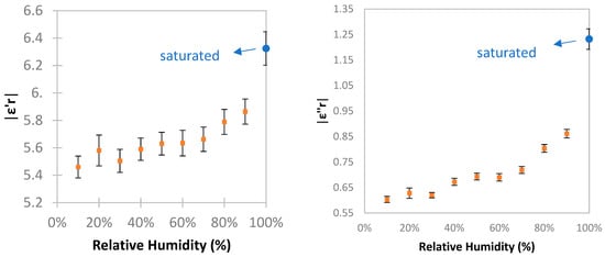 Humidity can dramatically affect the measured permittivity of TRC composites. For this reason, in order to provide a general understanding of this effect, and as a preliminary step towards applying MMW spectroscopy under different humidity conditions, the MMW permittivity of three reference TRC specimens (10 × 80 × 480 mm3) was measured at different relative humidity (RH) levels (Figure 12). The specimens were conditioned in a climate chamber at 20 °C for 24 h at each RH level starting from saturated conditions, and decreasing in 10% intervals down to 10% RH. The results, as expected, show an increase in the magnitude of both the real and imaginary permittivity of the composite with increasing RH, attributable to the high permittivity of water. The standard deviation of the calculated permittivity ranged between 2 and 3%. The point in blue in Figure 12 represents the TRC specimen in fully water-saturated conditions. From an RH of 10% up to saturated conditions, ε′r increases about 15%, while ε″r increases about 100%. The influence of humidity in the MMW measurements highlights the need for its consideration. This is crucial to ensure the accuracy and broader applicability of the technique.