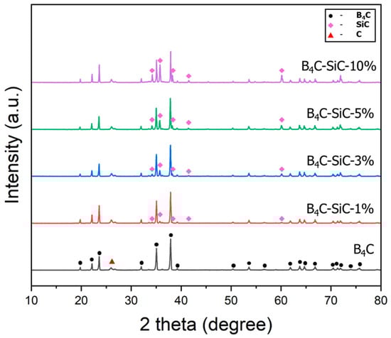 The effect of the SiC content on the phase compositions, physical properties, and microstructures of the B4C-SiC ceramic composites prepared through hot-press sintering at 2000 °C is shown in Figure 1, Figure 2 and Figure 3. Figure 1 shows that the XRD patterns of the composites only indicate the peaks of B4C and SiC, and no other phases are detected. As the SiC content increased from 1 to 10 wt%, the XRD peaks of the SiC phase became more distinct. Additionally, the XRD results show no peak shift for the B4C and SiC phases, suggesting no phase transitions or changes in the crystal structure. Comprehensively, no reactions occur between the SiC and B4C phases during the hot-pressing period, at least not enough to be detected by XRD (approximately less than 1%), and the SiC particles stably exist as an independent phase within the B4C matrix. Thus, following our design, it was confirmed that SiC is a feasible additive for fabricating B4C-based composites.