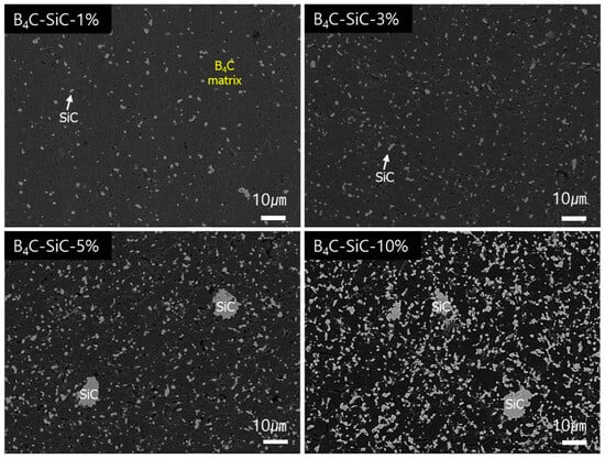 The SEM images captured in BSE mode (backscattered electron mode) using the contrast caused by differences in the atomic numbers of the elements in the sample allow for the phases to be clearly distinguished. The contrast between SiC and B4C was evident, allowing us to observe how SiC was distributed within the composite. SiC was uniformly distributed at 1 to 3 wt%, but agglomeration was partially observed starting with the 5 wt% addition, as shown in Figure 3. Despite the presence of minor agglomeration regions, especially at higher SiC contents such as 5 wt% and 10 wt%, the SEM images at higher magnification (Figure S3) still prove significant grain refinement and fragmentation of SiC particles through all the composites. Generally, when an excessive amount of secondary phase is added, agglomeration occurs, which negatively affects the microstructure of the composite and may lead to a decrease in strength [5,23,26]. However, since the amount of SiC added in this study was small (≤10 wt%), the number of agglomerations was low, and its impact was limited. In other words, even though some agglomeration occurred, the small amount did not significantly affect the uniformity of the microstructure, and the grain-growth-inhibiting effect of SiC still contributed to preventing a reduction in strength. These results suggest that the composite’s performance can be optimized with small amounts of additives and that the mechanical performance of the composite can be improved while minimizing the adverse effects of agglomeration.