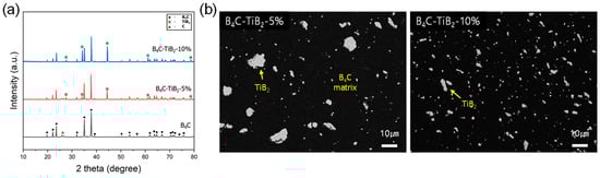 Like SiC, TiB2 has been widely used as a secondary-phase reinforcement material for B4C due to its high melting point (3230 °C) and hardness [7,22,26]. As shown in Figure 4a, the XRD analysis results indicate that the crystal structure changes with the addition of TiB2, showing a similar trend to that of SiC. Compared to pure B4C, the characteristic diffraction peaks of TiB2 appeared clearly in the composites containing 5 wt% and 10 wt% TiB2, indicating that TiB2 exists stably as an independent phase within the composites. As the amount of TiB2 increased, the intensity of the XRD peaks gradually increased, showing the same pattern as with the addition of SiC. TiB2 and SiC formed more distinct crystal structures within the composite as their content increased. This result demonstrates that TiB2 and SiC remain independent phases without causing phase transitions or chemical changes with B4C to be detectable by XRD, even after sintering. In conclusion, the XRD analysis results show that TiB2 exhibits a similar crystal structure and distribution pattern to SiC, with both substances existing independently and stably within the composite. TiB2 and SiC each play an essential role in enhancing the physical performance of the composite, and their stability was confirmed in the XRD patterns.