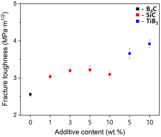 As a result, SiC and TiB2 significantly improve the fracture toughness of B4C composites through their respective crack propagation and reinforcement mechanisms. SiC blocks cracks within the grains through its transgranular crack propagation mechanism and promotes microstructural densification by inhibiting grain growth. TiB2 complicates crack propagation, thereby inducing crack path deviation and residual stress at grain boundaries and significantly increasing the fracture resistance of the composite. These two mechanisms suggest that the mechanical performance of the composite can be optimized even with small amounts of additives (≤10 wt%). The enhanced crack resistance can also be attributed to the enhancement of flexural strength in the B4C composites, along with the reduced grain sizes that increase the density of grain boundaries to act as barriers for cracks. In particular, the combination of SiC and TiB2 plays a crucial role in simultaneously improving the performance of the composite, effectively enhancing the durability and mechanical properties of B4C-based composites.
