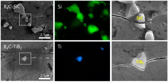 The crack propagation mechanisms of SiC and TiB2 are different, but each plays a crucial role in improving the mechanical performance of the composite. SiC has a transgranular crack propagation mechanism in which cracks are blocked within the grains [3,4,10,11,23]. As shown in Figure 6, when SiC is evenly distributed, cracks are interrupted upon encountering SiC particles, slowing crack propagation and consuming more energy. This delay in crack propagation results from the strong interfacial bonding between SiC and B4C, attributed to the mutual solubility and diffusion-reaction at the interface during the hot-press sintering above 2000 °C. That is, the better interfacial compatibility of B4C and SiC phases increases the fracture toughness of the composite. Simultaneously, SiC inhibits grain growth, promoting the densification of the microstructure and enhancing the strength of the composite.
