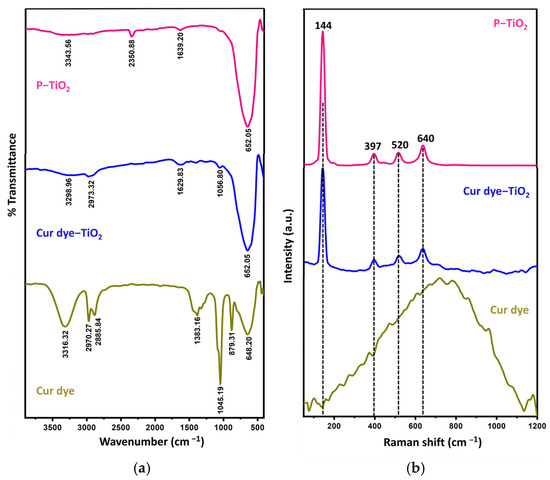 Raman spectroscopy contains insightful information regarding the molecular composition and interactions within Cur dye-TiO2, contributing to material characterization. Raman spectra, presented in Figure 2b, corroborate findings from FTIR spectra on P-TiO2, Cur dye, and Cur dye-TiO2. In the Raman spectrum for the P-TiO2, normal vibration modes, notably the prominent mode at 144 cm−1, indicate a well-resolved anatase phase. Additional peaks at 640, 520, and 397 cm−1 correspond to other vibration modes [29,30]. The Raman spectrum of Cur dye, spanning the 50–900 cm−1 range, reveals bending vibrations of phenyl rings (500–600 cm−1), out-of-plane bending (below 400 cm−1), and lattice modes and structural vibrations (600–700 cm−1) [31].