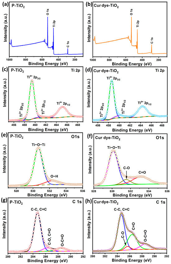 (a–h) XPS spectra of the survey, Ti 2p, O 1s, and C 1s for P-TiO2, and Cur dye-TiO2 as shown.