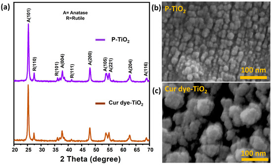 (a) XRD and (b,c) SEM analysis of the P-TiO2 and Cur dye-TiO2, respectively.