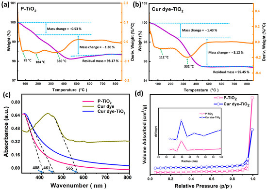 (a,b) presented (TGA + DTA) curves for both P-TiO2 and Cur dye-TiO2. (c) UV-vis spectra display P-TiO2, Cur dye, and Cur dye-TiO2. (d) Nitrogen adsorption-desorption isotherms and pore size distribution curves (inset) for P-TiO2 and Cur dye-TiO2 materials, illustrating their surface area characteristics and mesoporous structure.