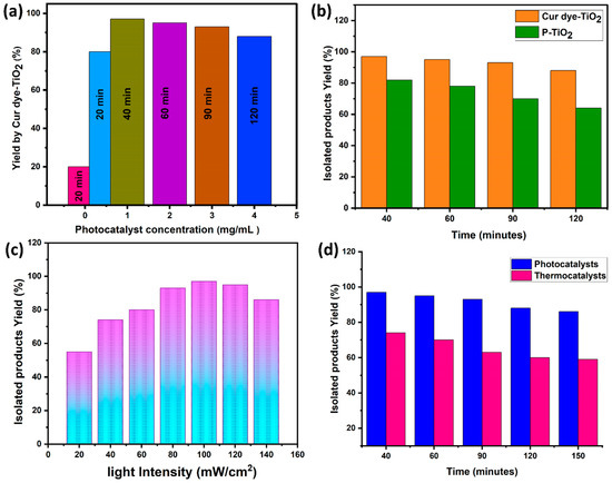 Illustrates the experimental arrangement for synthesizing compounds (4a–f) using the Cur dye-TiO2 photocatalyst under visible light at optimized conditions. (a) explores how the Cur dye-TiO2 concentration affects the yield (%) of the target products, (b) monitors the reaction time with Cur dye-TiO2 and P-TiO2, (c) investigates the impact of light intensity on the yield (%) of target products, and (d) examines the influence of photocatalytic versus thermocatalytic synthesis on the yield (%).