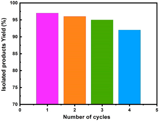 To investigate the practicality and sustainability of Cur dye-TiO2 photocatalyst, we examined its reusability, a criterion vital for decreasing costs and environmental effect. Multiple rounds of photocatalytic synthesis of quinazolines under visible light were performed to explore Cur dye-TiO2 reusability. Four cycles of reuse were conducted while maintaining the time of irradiation consistent at 40 min and utilizing an optimized concentration of Cur dye-TiO2 (1 mg/mL).