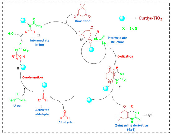 In this study, Cur dye-TiO2 was employed as a photocatalyst in a multicomponent reaction involving dimedone, urea/thiourea, and various substituted aldehydes to synthesize quinazoline derivatives (4a–f). The catalyst provided several advantages, including cost-effectiveness, environmental sustainability, and ease of recovery through simple filtration, thereby minimizing acidic waste and environmental impact. To test the adaptability of this approach, various aryl and heteroaryl aldehydes were successfully converted under optimized conditions, using 10 mg of Cur dye-TiO2 in 10 mL of ethanol (1 mg/mL) under visible light illumination. This method yielded high returns of quinazoline derivatives via a one-pot synthesis with straightforward product isolation.