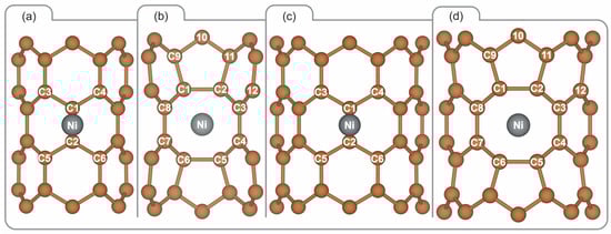 - Ambrusi, R.E.; Orazi, V.; Marchetti, J.M.; Pronsato, M.E. Ni Clusters Embedded in Multivacancy Graphene Substrates. J. Phys. Chem. Solids 2020, 138, 109258. [Google Scholar] [CrossRef]
