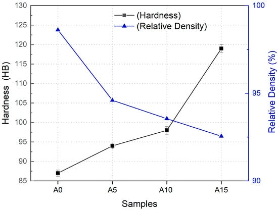 Figure 1 presents the hardness and relative density graphs of AA5083-Cr composite samples. The hardness values show a consistent increase with rising Cr content, achieving an approximate 50% improvement from sample A0 to sample A15. This increase can be attributed to multiple factors related to the reinforcement of Cr particles in the AA5083 matrix through the powder metallurgy process. One primary factor is solid solution strengthening. Chromium atoms partially dissolve in the aluminum matrix, disrupting the crystal lattice and hindering dislocation motion, thereby enhancing hardness [29]. Additionally, the dispersion of chromium particles within the aluminum matrix creates a second phase that obstructs dislocation movement, further contributing to the observed hardness increase [30]. The strong interfacial bonding between the chromium particles and the aluminum matrix improves the load-bearing capacity of the composite, amplifying its mechanical performance. The mechanical milling process also introduces deformation into the powders, enhancing hardness by refining the microstructure. Furthermore, chromium’s tendency to form precipitates within the aluminum matrix plays a pivotal role in the hardening mechanism. These precipitates act as obstacles to dislocation motion, thereby reinforcing the material’s hardness [31]. It is noteworthy that the dominant crystallographic plane observed in the AA5083/Cr composite samples is (111), a plane that is renowned for its high atomic packing density and resistance to deformation. The prevalence of this plane correlates with the observed increase in hardness, as the (111) plane in face-centered cubic (FCC) structures like aluminum offers higher resistance to dislocation motion compared to other crystallographic planes [32]. This reinforces the mechanical performance of the composite by serving as a naturally hard plane, which synergizes with the strengthening effects of the Cr particles. Conversely, the relative density curve reveals a decline with increasing Cr content, indicating higher porosity levels in the samples. At first glance, this appears contradictory since porosity typically correlates inversely with hardness and increased porosity often reduces hardness. However, this paradox is resolved when considering the significantly higher hardness of the Cr reinforcement material (125 HB) compared to the AA5083 matrix (85 HB). The superior hardness of Cr compensates for the negative impact of increased porosity, ultimately resulting in a net increase in hardness across the composite samples [19].