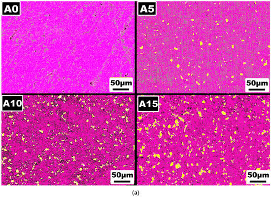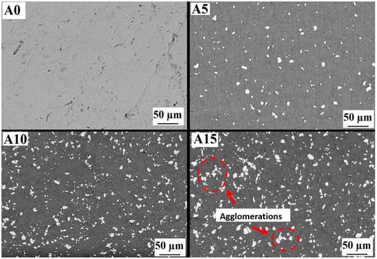 Figure 2 shows the microstructures of AA5083/Cr composites with varying Cr particle content. In the images, the light-colored phases represent Cr particles and the dark regions correspond to the aluminum alloy matrix. These microstructure images allow for an analysis of Cr particle distribution within the matrix and the homogeneity of the composite structure. In specimens A5 and A10, Cr particles are observed to be distributed homogeneously throughout the matrix. This homogeneous dispersion is crucial for enhancing the composite’s mechanical properties, as it ensures consistent material performance across the structure [33,34]. The primary reason for this uniform distribution is the mechanical alloying process applied before pressing [35,36]. Mechanical alloying ensures thorough mixing of the powders, which promotes even distribution during subsequent processing. However, in sample A15, a localized agglomeration of Cr particles is observed. Agglomeration refers to the clustering and aggregation of Cr particles within the matrix. This phenomenon becomes more pronounced as the reinforcement content increases, leading to a loss of homogeneity. Such localized agglomerations can weaken certain areas of the composite, adversely affecting its overall mechanical properties. They may also act as stress concentrators, potentially reducing the material’s performance under load. The mechanical alloying process typically prevents agglomeration by promoting fusion and a uniform distribution of powders. However, as the reinforcement content surpasses a certain threshold, maintaining homogeneity becomes more challenging. This underscores the importance of optimizing the reinforcement content to achieve a balance between improved mechanical properties and maintaining structural uniformity.