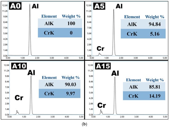 The elemental mapping photograph obtained at high magnification for samples are presented in Figure 3a. In this image, the purple regions represent the AA5083 phase and the yellow regions indicate the Cr phase. As shown in the figure, there is a distinct separation between the purple and yellow areas. If an intermetallic phase had formed in the structure, regions with overlapping purple and yellow colors would be visible, indicating the presence of both elements in the same phase. However, the sharp boundary observed in the elemental mapping confirms that no intermetallic phase is present in the structure. A comparison can be drawn with a similar study in which AA2024/316L SS particle-reinforced composites were produced [37]. In that study, intermetallic phases formed at the interfaces between the matrix and reinforcement were visible as mixed regions in the elemental mapping, reflecting the presence of both elements. In contrast, in the current study, as verified by both the XRD analysis and elemental mapping results, no secondary phase or intermetallic compound formation is detected. This finding further emphasizes the distinct separation between the AA5083 and Cr phases in the composite. Moreover, elemental analyses of the samples were conducted to evaluate the distribution and composition of the matrix and reinforcement elements (Figure 3b). The results indicated that the ratio of the matrix element (Al) to the reinforcement element (Cr) does not exhibit any drastic changes. This consistency can be attributed to the uniform distribution of Cr particles achieved during the mechanical milling and consolidation processes. The addition of Cr reinforcement did not alter the matrix composition significantly, as the primary elements of the AA5083 alloy remained stable across all samples. This suggests that the powder metallurgy process, combined with optimized milling parameters and the use of a small amount of methanol to prevent agglomeration, successfully maintained the elemental integrity of the matrix while incorporating the reinforcement.