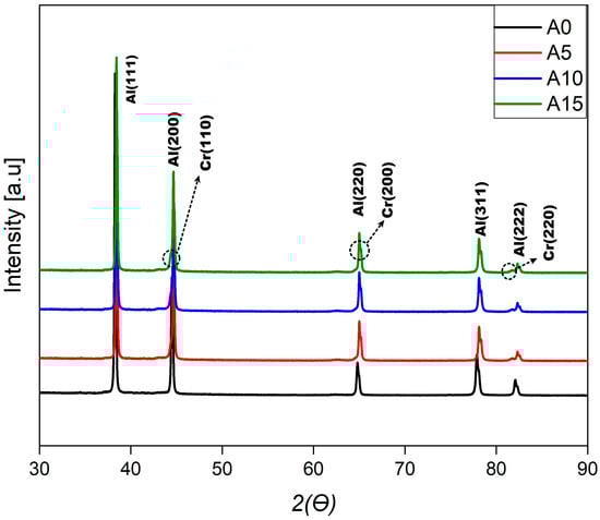 The X-ray diffraction (XRD) spectra for the base metal and composite samples are shown in Figure 4. Analysis of the XRD spectra reveals the most prominent peak phases at 2θ values of 37.94°, 44.19° and 60.00°. These peaks correspond to the hkl Miller index planes (111), (200), (220), (311) and (222), respectively [38]. An increase in the quantity of Cr reinforcement leads to an enhancement in the intensity of the XRD peaks, which suggests an improvement in the crystallographic structure of the materials. The absence of intermetallic and oxide peaks in all samples indicates that the hot-pressing process was insufficient in regard to promoting oxidation and effectively prevented interactions between the AA5083 and Cr materials [38]. The solubility of chromium in aluminum is limited, and the formation of new intermetallic phases in the AA5083 alloy occurs only if this solubility limit is exceeded. In this study, it is likely that the chromium remained dissolved in the alloy without forming intermetallic phases due to its constrained solubility. Additionally, a structural mismatch between the crystal structure of the AA5083 alloy (face-centered cubic, FCC) and that of chromium (body-centered cubic, BCC) could impede the orderly incorporation of chromium atoms into the aluminum matrix. This incompatibility may hinder the formation of new intermetallic phases [14,39].